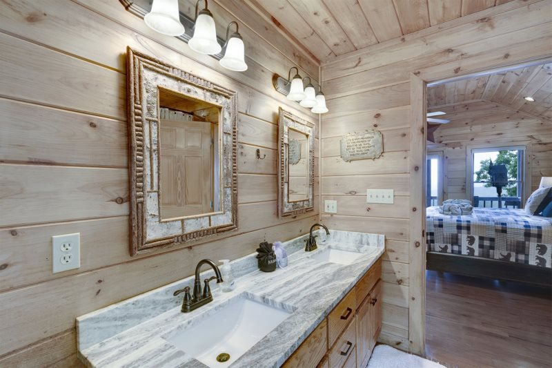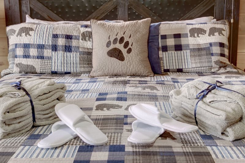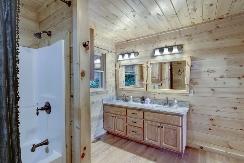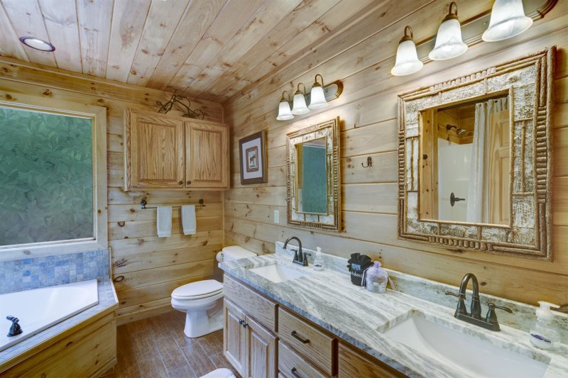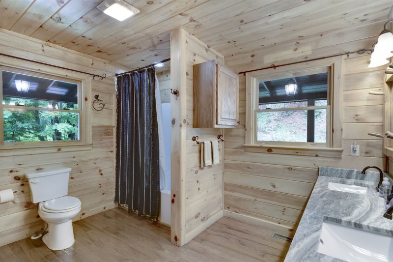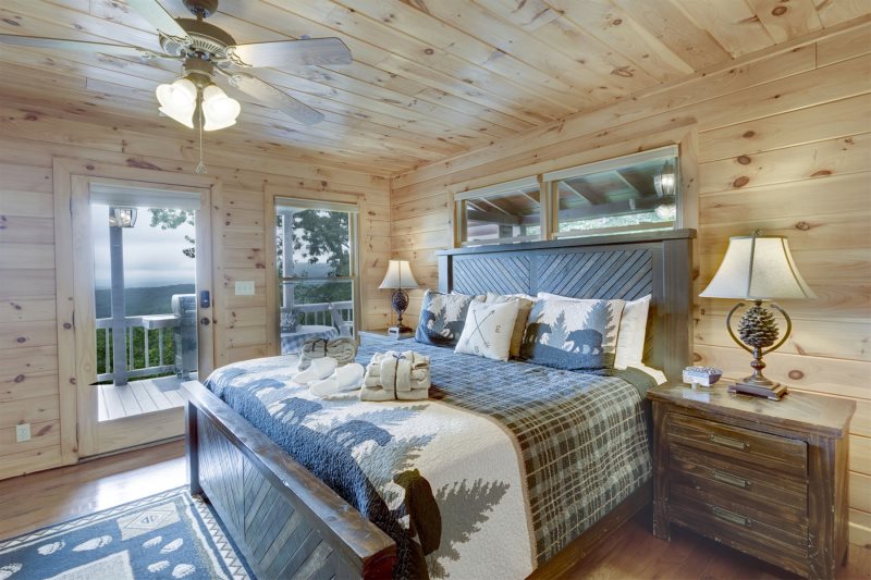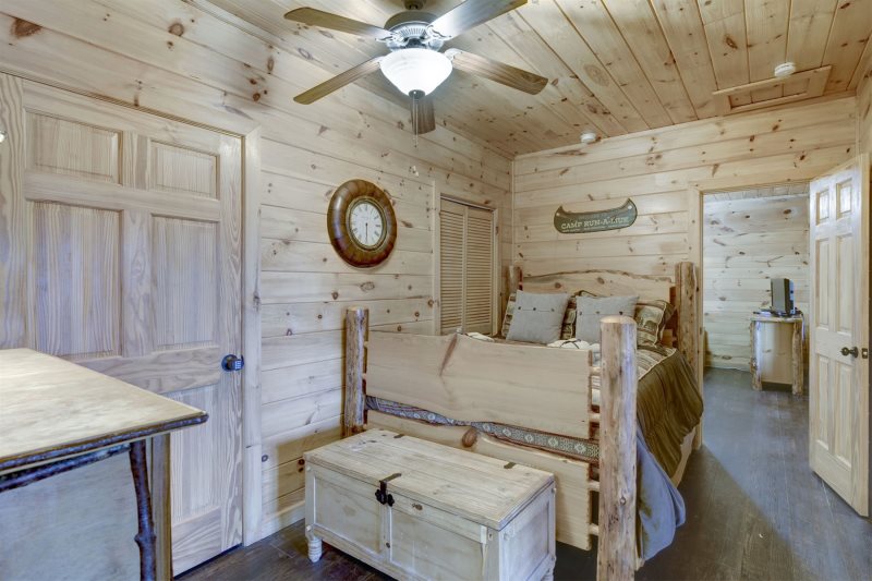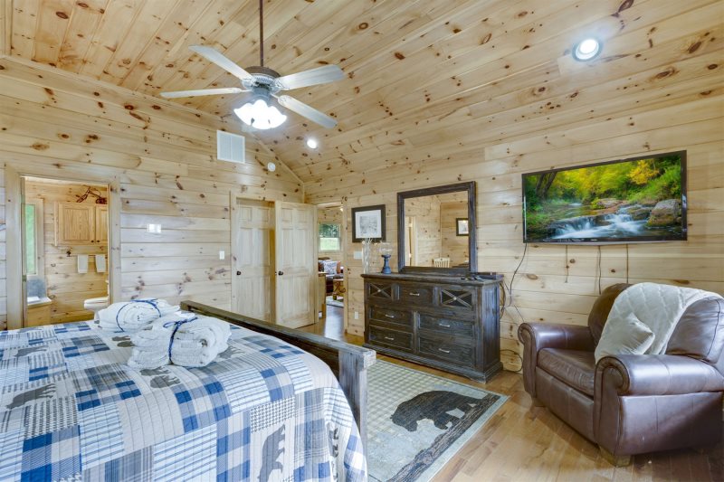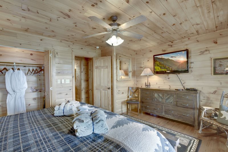 King Bedroom: Settle into a restful king haven wrapped in golden pine. A solid-wood bed dressed in cabin-chic quilts faces a wall-mounted SmartTV while pinecone lamps warm the room and a gentle ceiling fan stirs a breeze. From the private access, step onto the main deck for first-light views or starry goodnights. A step-in closet and broad dresser keep gear tidy—then slip into plush Turkish robes and slippers. Shared Bathroom: Just steps away, the bright shared bath keeps mornings easy: dual-sink stone vanity, soaking tub/shower combo, and a tucked-away laundry closet with full-size washer and dryer. see Amenities for more.