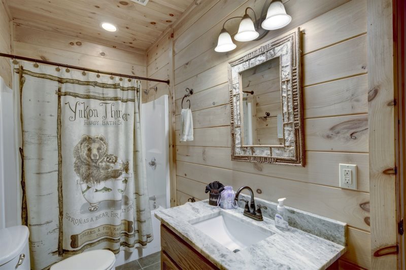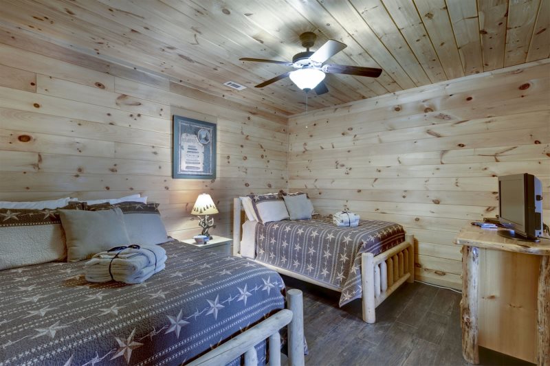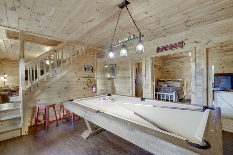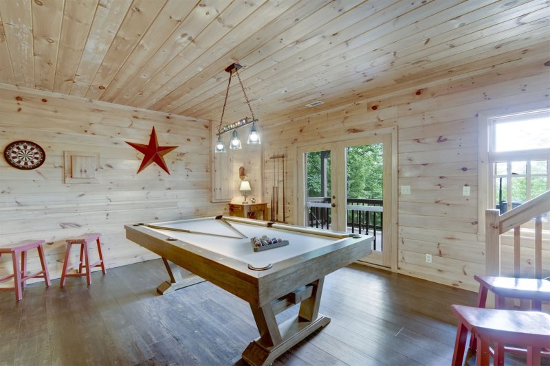 Fun Down Under: Here, the fun begins. The game room, wrapped in pine, is primed for friendly rivalry on a regulation billiards table under trio pendant lights. A dart board is on standby, and red spectator stools for plotting your next shot. Mountain Access: Throw open the French doors to the terrace deck and breath in mountain magnificence. Steps away, the media lounge gathers everyone by a floor-to-ceiling stone fireplace and big SmartTV; a plush leather armchair and comfy leather sofa invite movie marathons. Two Ways to Dream: Beyond the “Cabin Fever” doors, two restful bedrooms await. A cozy queen with trunk and dresser, and a rear retreat with two log-framed fulls, ideal for kids or cousins. Rinse & Revive: A shared full bath with soaking tub/shower combo and spa essentials keeps the crew refreshed between games, hikes, and hot-tub soaks. see Amenities by Area for more.