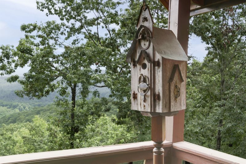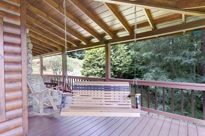 Skyline Porch: Step onto a wide, fully covered deck where the horizon rolls for miles over Blue Ridge while treetops sway at eye level. Claim glider chairs with ottomans. Cuddle up on the lovers’ swing, or rock in red Adirondacks beside the river-rock, wood-burning fireplace. Morning coffee tastes better here; evenings hum with wildlife sounds as lantern pendants warm the timber ceiling. Al Fresco Life: Gather at the picnic table for easy meals, then hand the tongs to your pitmaster at the hard-lined gas grill. With doors from the great room and main-level king opening onto the deck, the flow is effortless. Grab refills, step to the rail, and watch cloud shadows drift across stunning mountain ridgelines. see Amenities for more.