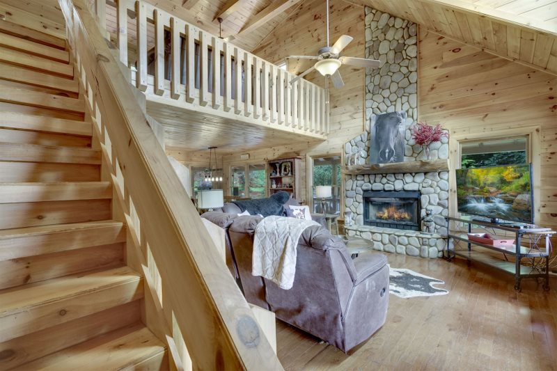 Your Walk-In Wow: Sun-kissed pine walls vault to the lofted rafters, greeting you with a warm mountain hug the moment you step inside. River-rock climbs the grand fireplace, anchoring plush power-reclining sofas that invite lazy chats and late-night movies.Kitchen & Dining: Just steps away, a granite-topped kitchen keeps the conversation flowing. Stainless appliances, double-oven range, and a dual coffee station stand ready while friends perch at the two-seat island or gather around the farmhouse table for eight. Gather & Glow: Warm by the crackling gas log fireplace, stream a favorite show, or watch sunset light dance across wood grain and stone—this open heart of the cabin is made for connection, comfort, and lingering laughter. see Amenities for more.