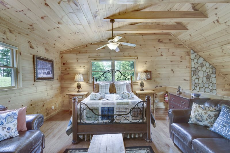 - Pine-Paneled Walls & Vaulted Rafter-Gripping Ceilings