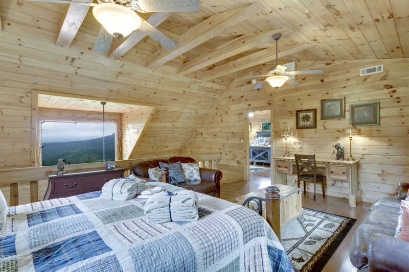 Lofted Retreats: At the top, two restful spaces share the treetops. Under vaulted rafters, the open loft doubles as a cozy lounge. A queen bed is flanked by lamps, a leather sofa and club chair and a rustic desk for laptops or late-night journaling. Master King Suite: The private King Suite feels like a sanctuary. Chestnut floors, pine paneling, and a big stately timber bed invite slow mornings and deep sleeps. Dresser and mirror, a large Smart TV, and a comfy leather recliner round out the room’s creature comforts. Balcony Beauty: French doors lead to a private balcony deck with cushioned chaises and far-view horizons—perfect for sunrise splendor and moonlit memories. Ensuite Bathroom: The ensuite pampers with a jetted corner tub framed by privacy windows, a separate shower, double-granite vanity with framed mirrors, and a discreet water closet, plus plush robes and spa essentials. see Amenities for more.