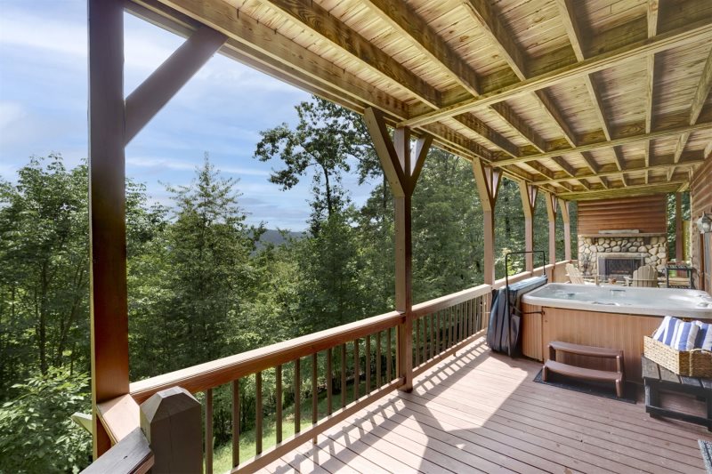 Terrace Tranquility: Slip down to a fully covered deck cradled in treetops with long-range ridgelines. Open rails invite mountain breezes. Lantern sconces add a mood-setting evening glow, and the outside stairs link you back to the main porches. Scenic Soaker: A 4-person soul soothing deluxe hot tub—drained, sanitized, and pH-balanced before arrival—beckons for starry soaks and sunrise sessions. see Amenities for more.Starry Fiery Nights