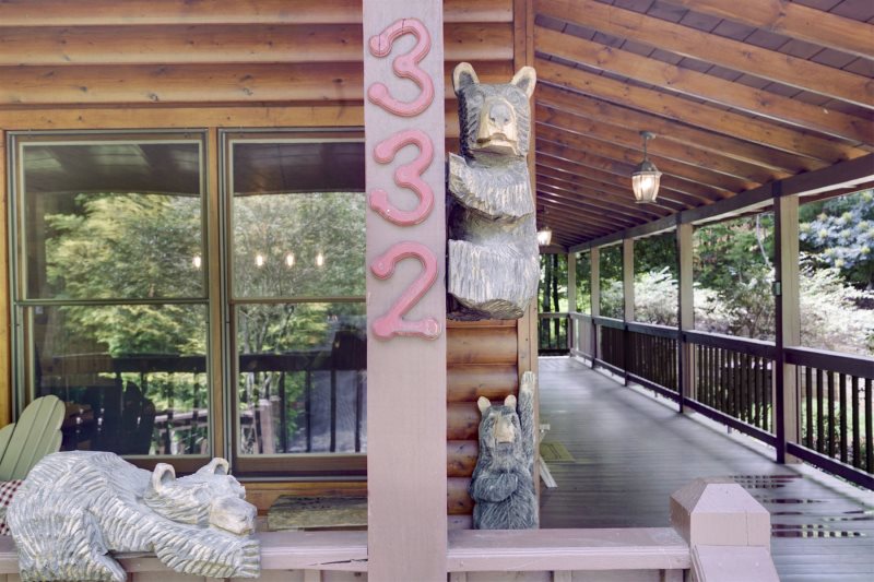 - Custom Wood-Carved Bear Cubs on Deck Post & Railing w/Welcoming, Wood-Carved, Standing Bear