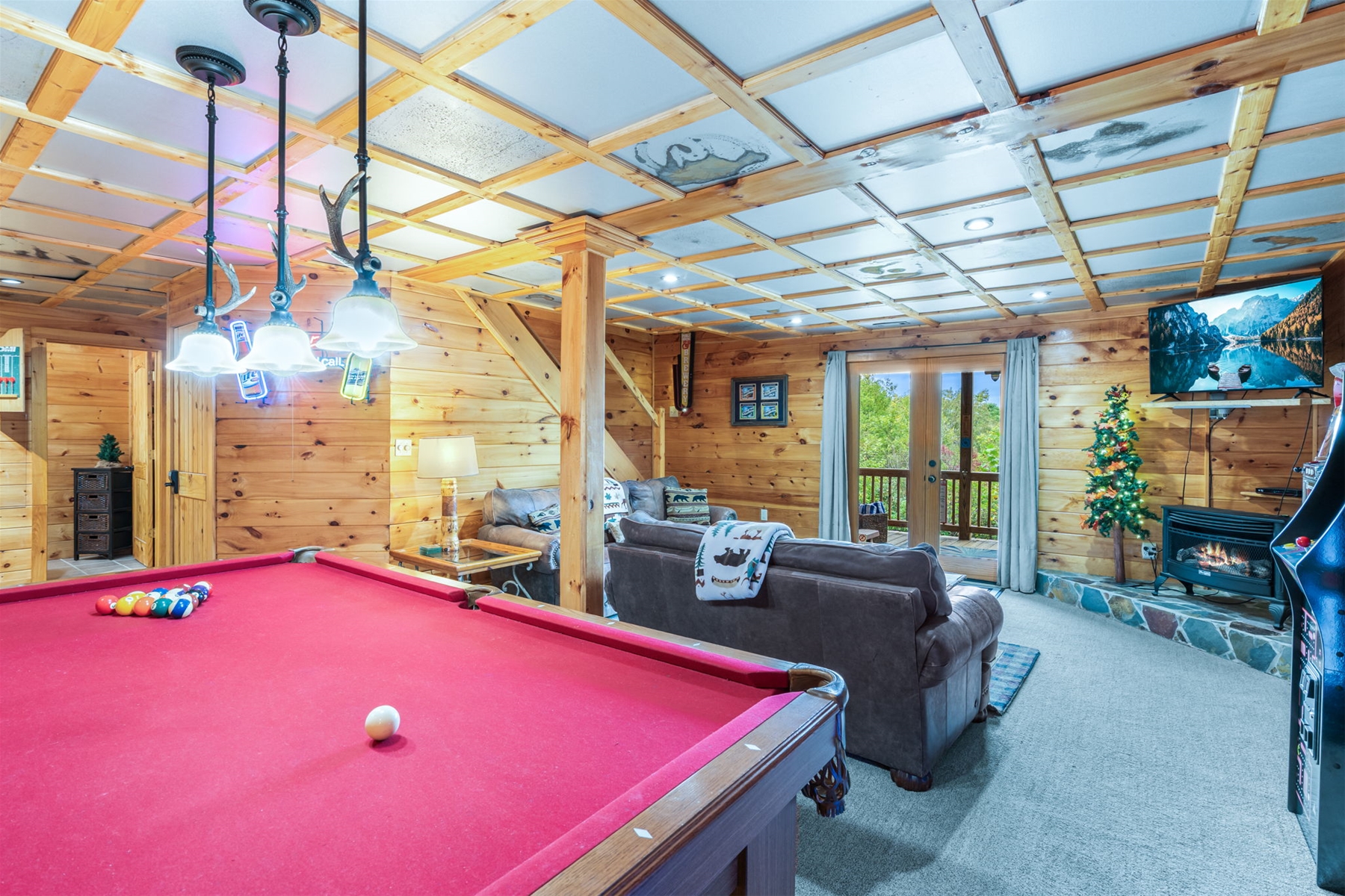 Fun Down Under: Cue the competition. This pine-wrapped game den puts friendly rivalry front and center. A regulation-size pool table anchors the space while a classic arcade, slot machine, jukebox and a dartboard line the walls for entertainment. Plush leather sofas and sling-back chairs give spectators a comfy perch. Café-height stools and a cozy table keep snacks and scorecards close by. Warm, lodge-style finishes and pocketed lighting make late-night match play feel perfectly at home. Media & Hearth: When the cue sticks rest, the media lounge takes over. A stone-faced gas-log fireplace sets a mellow tone while a large Smart TV handles movie nights and sports. Soft rugs, layered lighting, and wood-paneled walls keep the vibe snug. And French doors open to a terrace deck so fresh-air breaks and mountain views are always a step away. King Bedroom: Tucked off the game room, the king bedroom is all log-frame charm and slow-morning comfort. A handcrafted timber bed wears cloud-soft bedding. A dresser and wall-mounted TV add practical touches, and windows frame treetop mountain views. Thoughtful details like plush robes, soft lighting, and ample closet space make this a restful retreat after an evening of games. Rinse & Revive: A shared full bath keeps everyone refreshed. An easy soaking tub/shower combo, bright sink and mirror, and stocked towels with toiletries make quick rinses or longer soaks simple. It’s the practical, well-appointed pit stop between hikes, hot-tub dips, and round after round of billiards. see Amenities by Area for more.