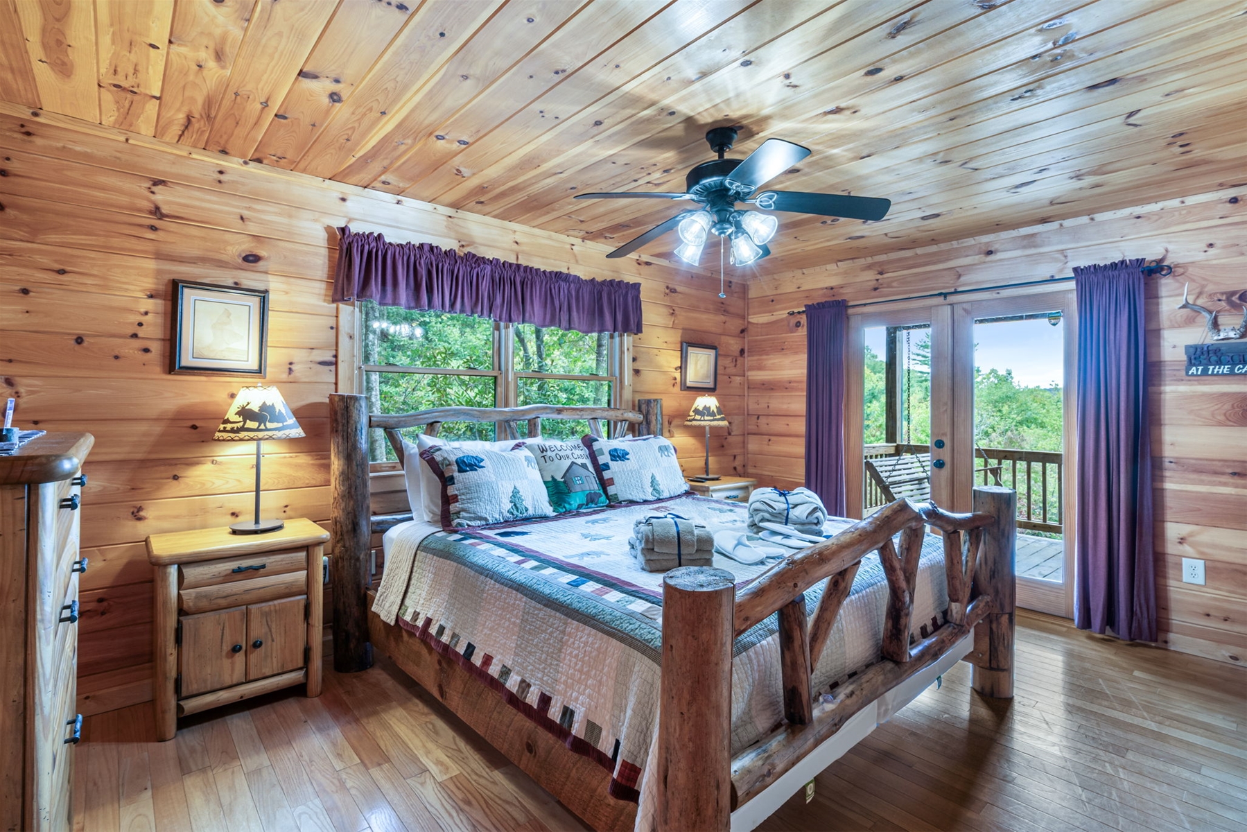 Slip-In Sanctuary: Rest easy on a handcrafted log king dressed in cabin-quilt linens and layered throws. Warm pine walls, a breezy ceiling fan, and a wall-mounted Smart TV create a cozy, private retreat—perfect for quiet mornings or late-night reading.