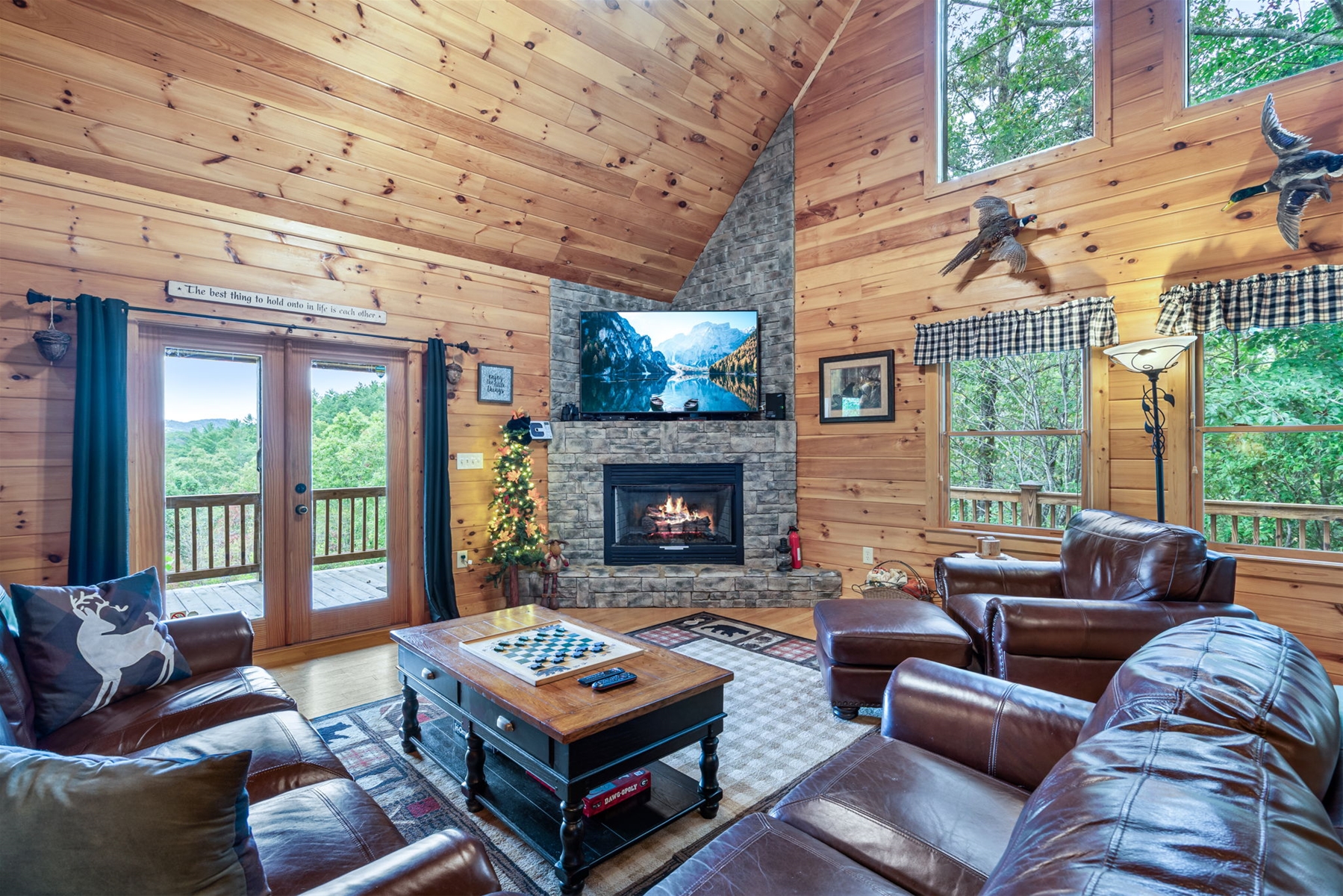 Your Walk-In Warmth: Vaulted knotty-pine ceilings and sunlit windows welcome you. Wide-plank floors lead to a stone-hearth fireplace that anchors the room—leather seating arranged for conversation and French doors lead to mountain and valley views. The space feels both cozy and airy, the kind of room that encourages slow mornings and long evening talks.