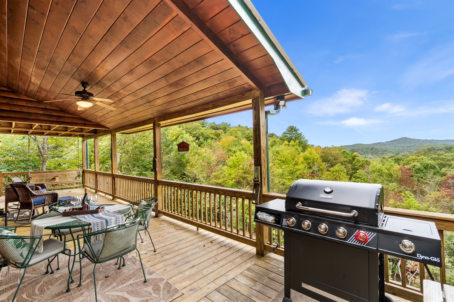 Skyline Porch: Step out from the great room onto a wide, fully covered deck that frames rolling treetops and distant ridgelines. The deep overhang and ceiling fan make mornings breezy and afternoons pleasantly shaded, while the lovers’ swing and woven gliders invite slow reading or cloud-watching.