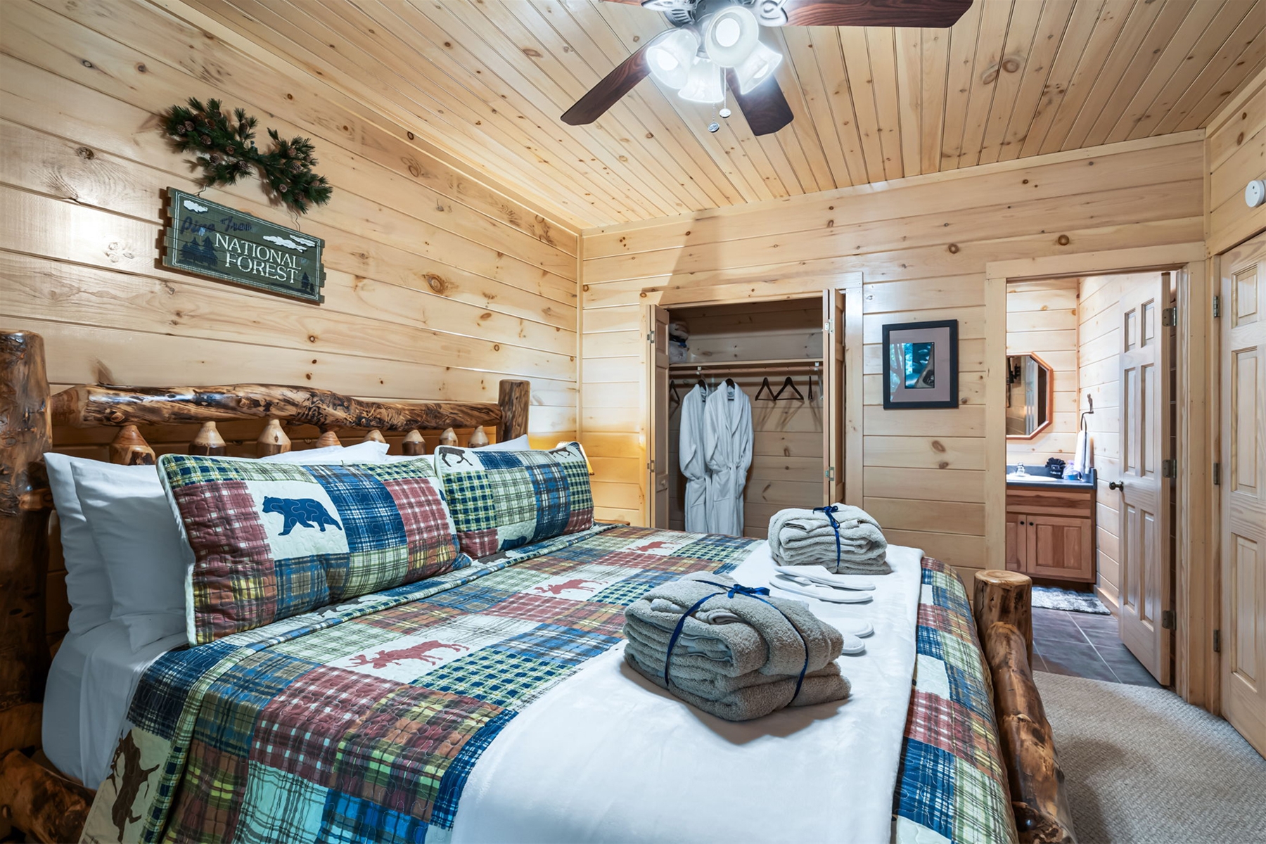 Settle into another main level restful king haven wrapped in knotty pine—sturdy log bed dressed in cabin quilts. A breezy vaulted ceiling fan and large scenic windows open the room. Simple storage and a chair keep clutter away. Ensuite Bath: Neat and functional: soaking tub/shower combo, single-sink vanity, and wood-trim details. Fresh towels and subtle cabin charms keep mornings easy. see Amenities for more.