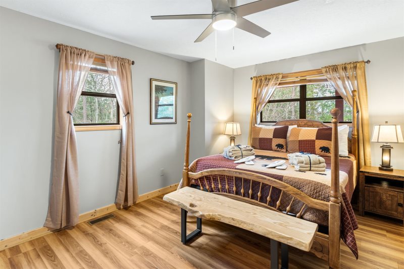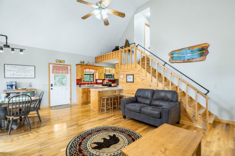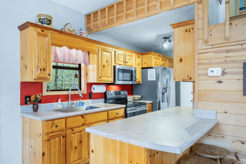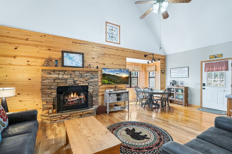 Savor Serenity: Step inside where soaring ceilings and walls of rich timber glow with warmth, while gleaming wide plank floors stretch out beneath you, instantly setting a mood of rustic elegance and mountain calm. Kitchen & Dining: The heart of the home pairs custom pine cabinetry with easy-care counters, accented by an open-framed header with exposed beam adding rustic character that keeps the kitchen visually connected to the dining nook and great room. A two-stool breakfast bar invites conversation over morning gatherings, while the bay-window dining nook—topped by modern directional track lighting— offers a charming stage for family dinners. Hearth & Harmony: Plush leather seating circles the river-rock fireplace with a mounted big-screen TV. A picture window frames the view, while a breezy ceiling fan whispers above. The entire space is designed for connection, comfort, and unhurried evenings. see Amenities for more.