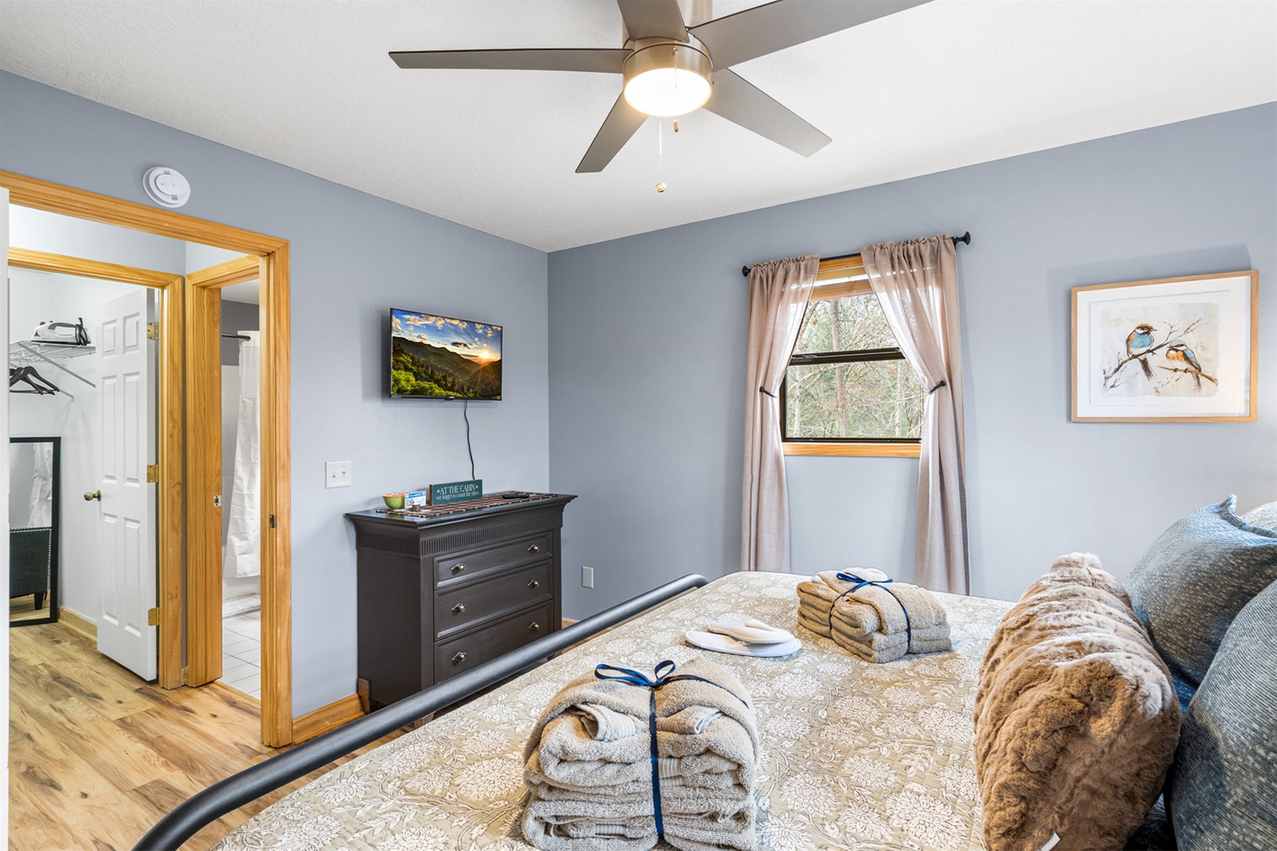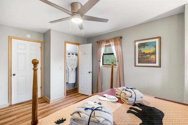Masterful Queen Retreat: Drift into comfort where warm chestnut floors set a soothing tone. A queen bed, dressed in plush pillows, quality linens, and a cozy throw, invites unhurried mornings. Matching wood furnishings and a contemporary brushed-nickel ceiling fan add a touch of modern elegance. Cleansing Escape: The ensuite bathroom beckons with a soaking tub/shower combo, big mirror and vanity. Turkish robes, takeaway slippers, and a complimentary spa bag ensure every moment feels indulgent. see Amenities for more.