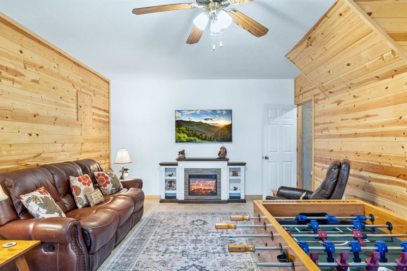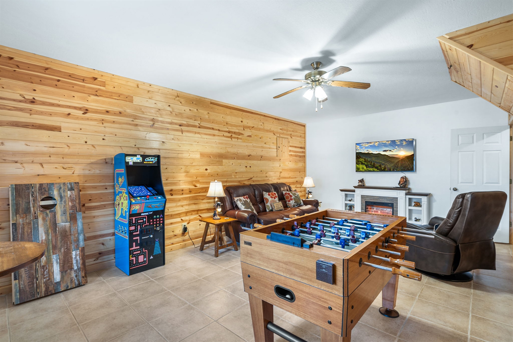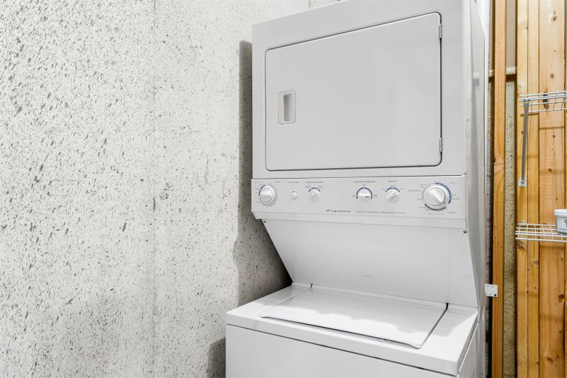 Game On, All Day Long: The lower level opens into a bright expanse designed for hours of fun and laughter. Challenge your crew to a fast-paced foosball showdown. Relive the classics with a vintage Pac-Man arcade console and see how long you can outrun those ghosts. Or take the fun outside and grab the cornhole boards. Cozy Corner: Between games, settle into the cushioned sofa or captain's lounge chair and watch your shows on the big wall-mounted Smart TV that anchors the lounging area. Wash & Care Convenience: The convenient laundry units let you wash, dry, and refresh your clothes without missing mountain time. Bunk Up Bedroom: After a full day of mountain adventures, the kids can wind down and crash happily into the lower-level bunk beds—their own cozy hideaway to recharge. This cheerful bunk room features a handsome wood bunk-bed set and a closet full of board games for nighttime nostalgia before bed. Attached Bathroom Comforts: The bunk room’s private en-suite bathroom adds extra convenience, giving kids their own easy space for showers and bedtime routines. see Amenities by Area for more.