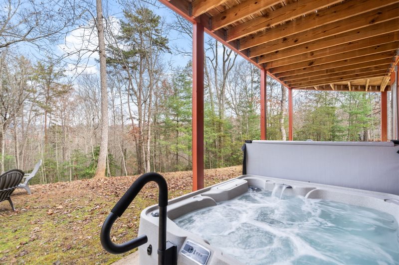Terrace Tranquility: Step down to the terrace patio where nature’s embrace meets indulgent amenities. Gaze out to winking stars while relaxing in your own bubbling sanctuary—a freshly filled, pH-balanced, 5-person brand new spa designed to melt stress with every jet. Just steps away is the stone circle fire pit inviting deep conversations or quiet reflection. Relaxation Redefined: Everything here is intentional: striped towels draped and ready, mountain woodland breezes drifting in, and the subtle scent of pine mingling with wood smoke. Whether it’s a crisp morning soak, a twilight toast, or an after-dinner firelight linger, this patio is more than a place—it’s a feeling. see Amenities for more.